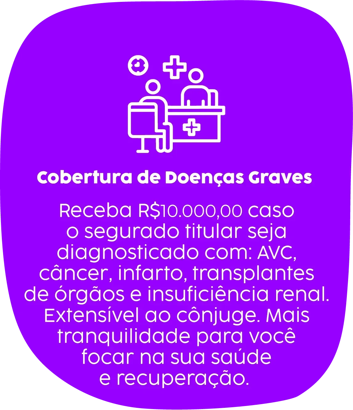 Cobertura de doenças graves: São R$ 10 mil de cobertura em decorrência do primeiro diagnóstico ao segurado titular de uma das doenças graves: AVC, câncer, infarto, transplantes de órgãos e insuficiência renal. Extensível ao cônjuge.